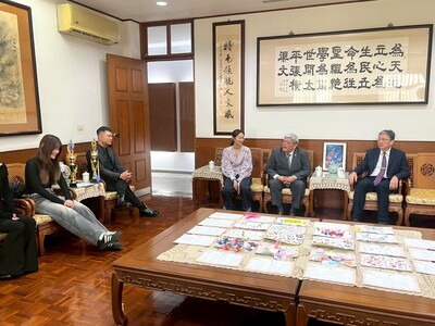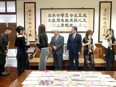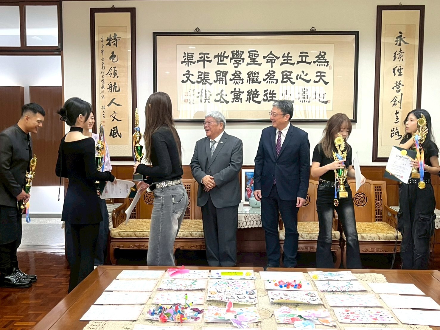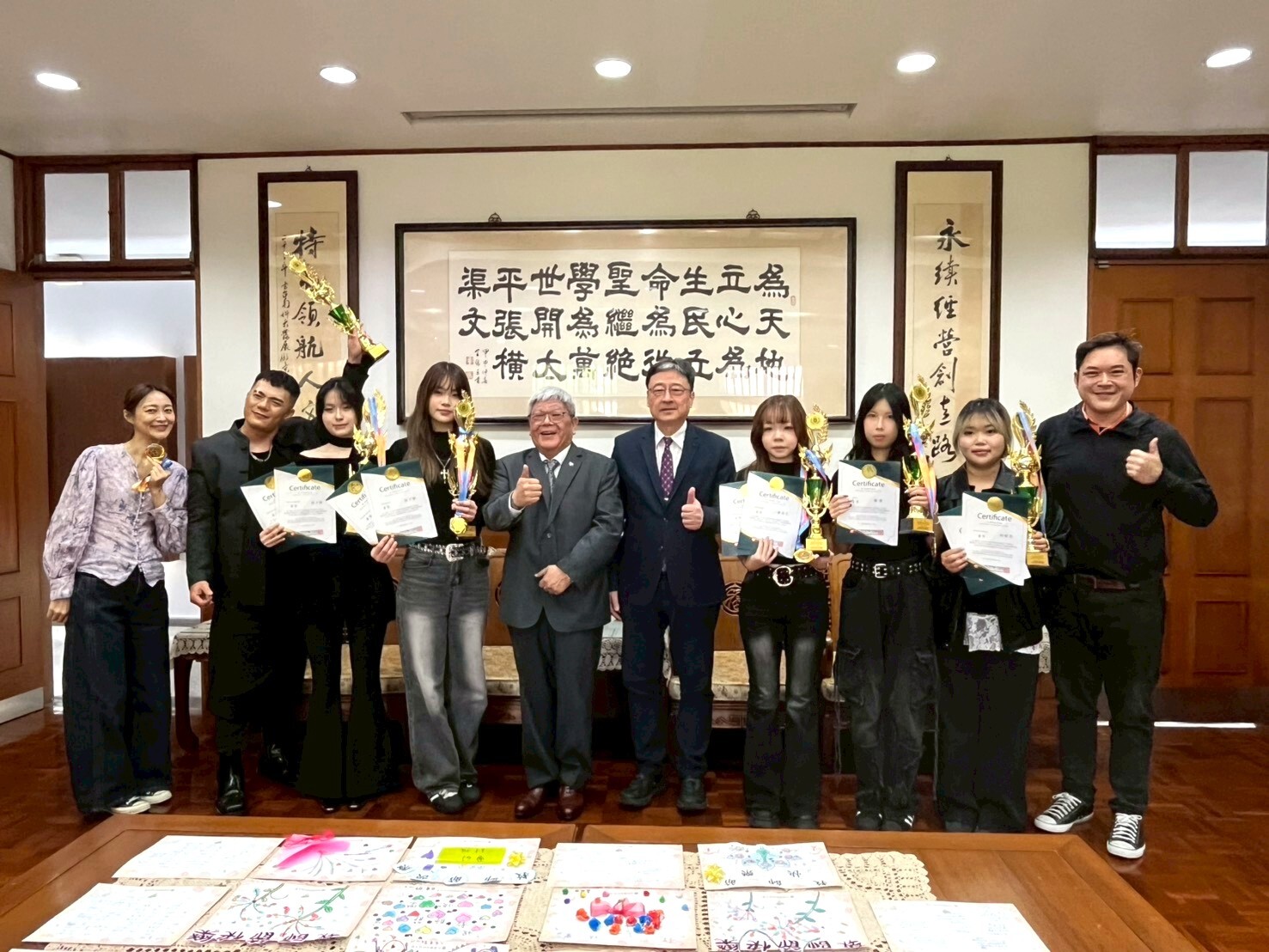 黃董事長與美容系得獎同學合影,給予鼓勵