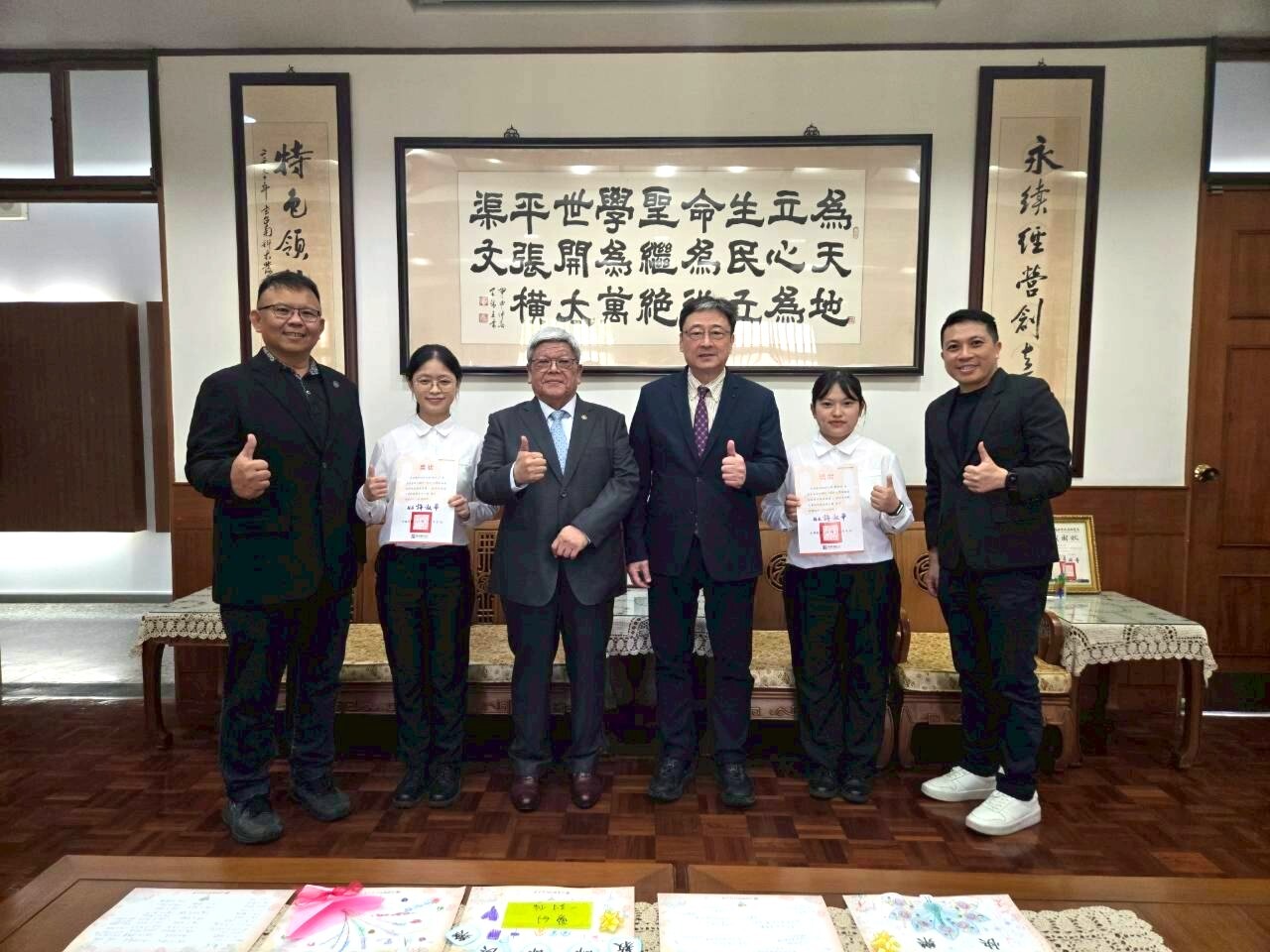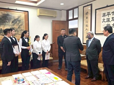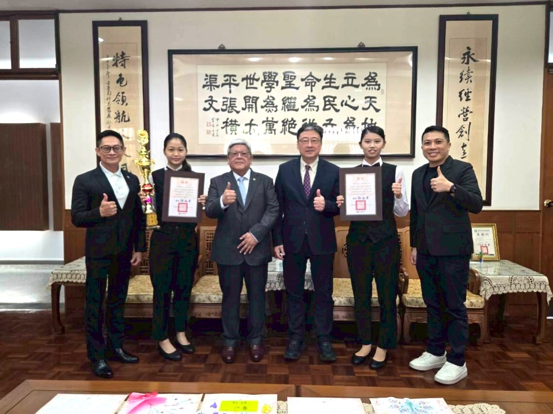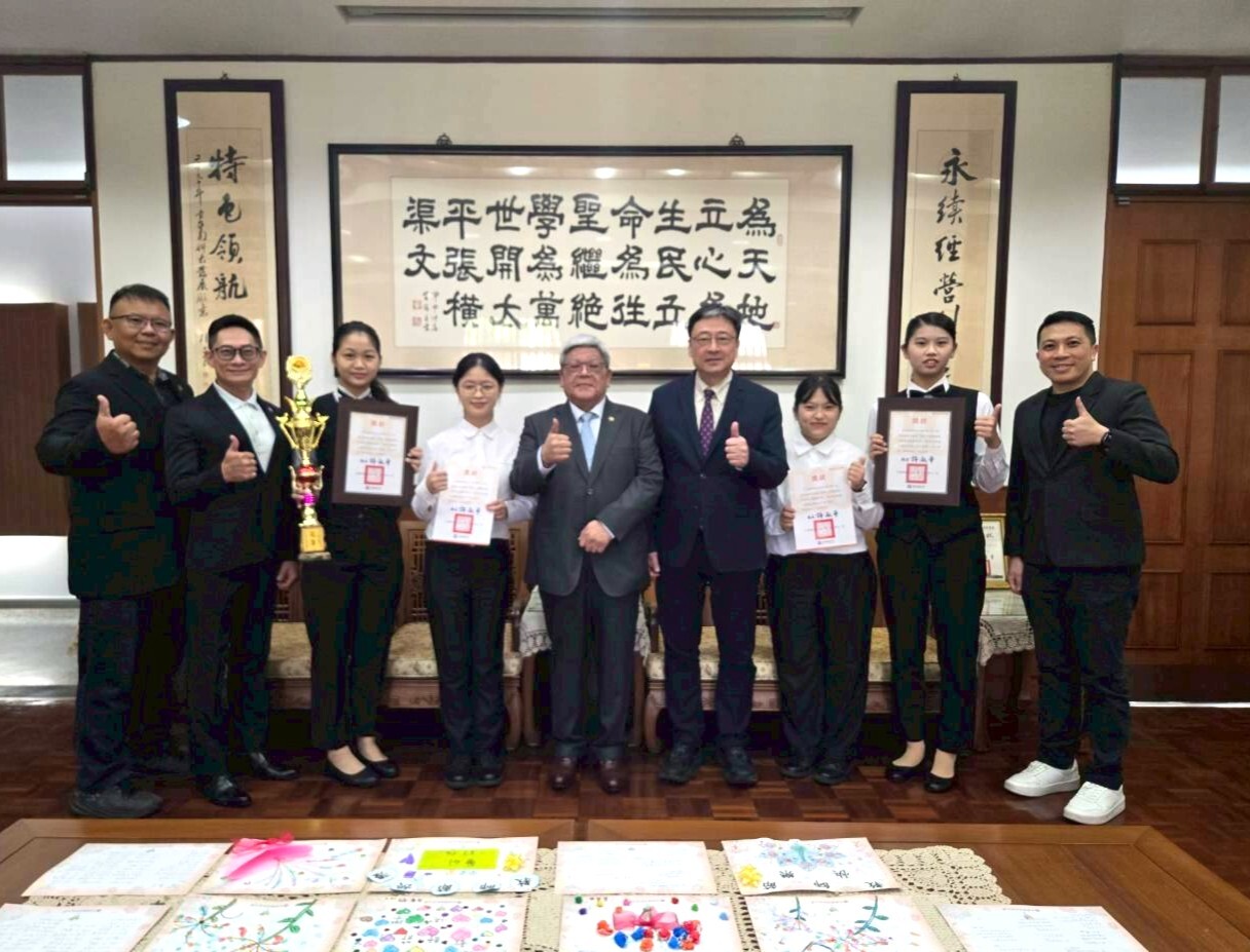 黃董事長與旅館系得獎同學合影,給予鼓勵