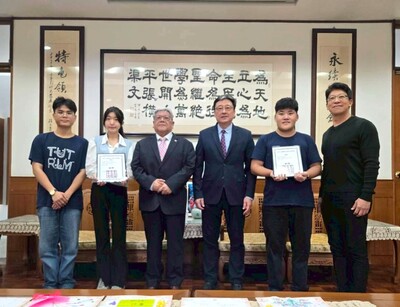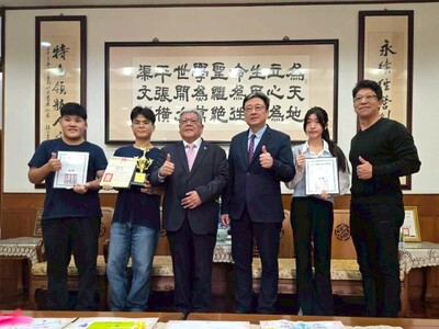 黃董事長與養生系得獎同學合影,給予鼓勵
